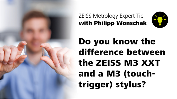 In this ZEISS Metrology Expert Tip video Philipp Wonschak explains in detail the difference between a ZEISS M3 XXT stylus and a M3 (touch-trigger) stylus. Furthermore, he addresses the question: why a normal M3 stylus should never be used with a VAST XXT probe.